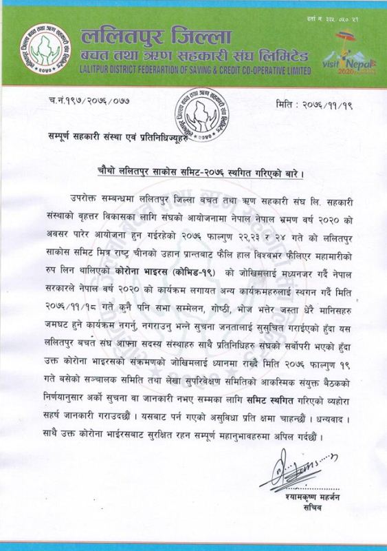 ललितपुर । चौथो ललितपुर साकोस समिट–२०७६ स्थगित भएको छ । ललितपुर जिल्ला बचत तथा ऋण सहकारी संघको आयोजनामा फागुन २२,२३ र २४ गतेकालागि तय भएको समिट अर्को सूचना नआए सम्मका लागि स्थगित भएको बचत संघ ललितपुरले जनाएको छ ।