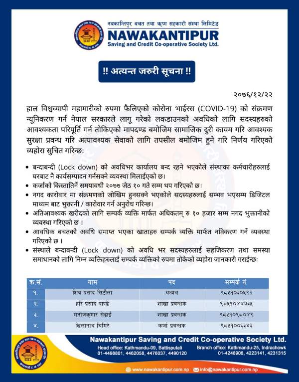 साथै संस्थाले कर्जाको किस्ता तिर्ने म्याद जेठ १० गते सम्म थपेको छ भने निक्षेपको नविकरणका लागि सम्पर्क ब्यक्ती मार्फत कार्य गर्न सकिने जनाएको छ । संस्थाले सूचनामा सम्पर्क ब्यक्ती र नम्वर समेत प्रकाशन गरी सदस्यले सम्पर्क गरी सेवा लिन सकिने जनाएको छ ।