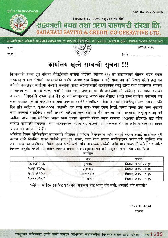 संस्थाले ०७७ साल बैशाख ३ गते सम्म उक्त समयमा प्रति दिन प्रति व्यक्ती एक लाख सम्म बचत भुक्तानी दिने निर्णय भएको संस्थाका प्रवन्धक बालकुमार बास्तोलाले बताए । साथै ऋणी सदस्यले चैत्र मसान्त सम्म ऋणको किस्ता तथा ब्याज बुझाए ब्याजमा दश प्रतिशत छुट दिने निर्णय भएको प्रवन्धक बास्तोलाले जानकारी दिए ।