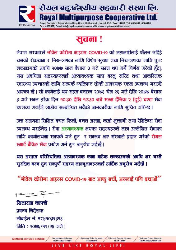 काठमाडौं । बसुन्धरामा रहेको रोयल बहुउद्देश्यीय सहकारीले सदस्यलाई दैनिक दुई घण्टा कार्यालय खोली सेवा दिने जनाएको छ । संस्थाले ०७७ साल बैशाख ३ गते सम्म दैनिक विहान साँढे १० बजे देखि दिउँसो साँढे १२ बजे सम्म सेवा दिने र अन्य समयमा संस्थाले तोकेको सम्पर्क ब्यक्ती मार्फत सेवा लिन सूचना जारी गरेको छ ।