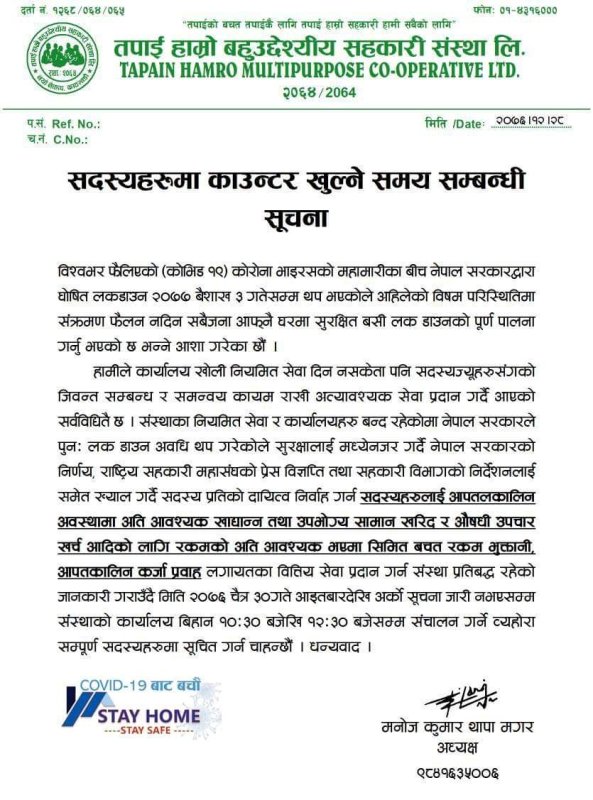 काठमाडौं । नैकापमा मुख्य कार्यालय रहेको तपाइहाम्रो बहुउद्देश्यीय सहकारीले सदस्यलाई दैनिक दुई घण्टा कार्यालय खोली सेवा दिने जनाएको छ ।