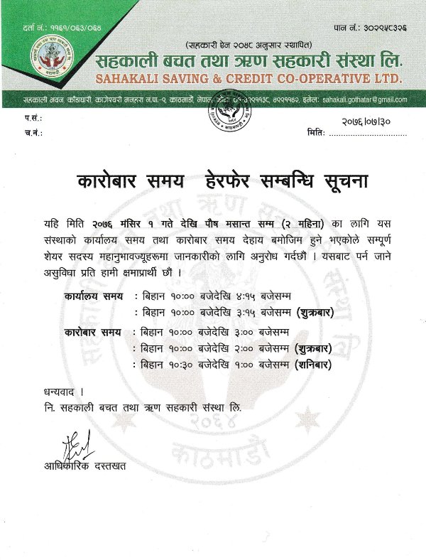 विश्व कोरोना भाइरसको संक्रमणले थलिरहेको र नेपालमा समेत पूर्ण लकडाउनको अवस्था रहेको हुँदा दैनिक ज्याला मजदुरी गर्ने, कोठा भाडामा वस्ने लगाएतका विपन्न वर्गलाई राहत पुगोस् भन्ने उदेश्यले स्थापना भएको विपत व्यवस्थापन कोषमा संस्थाले उक्त रकम सहयोग गर्ने निणर्य गरेको संस्थाका अध्यक्ष राधेश्याम खड्काले बताए । साथै संस्थाले कार्यालयबाट कारोबार गर्ने समयको हेरफेर गरेको छ ।
