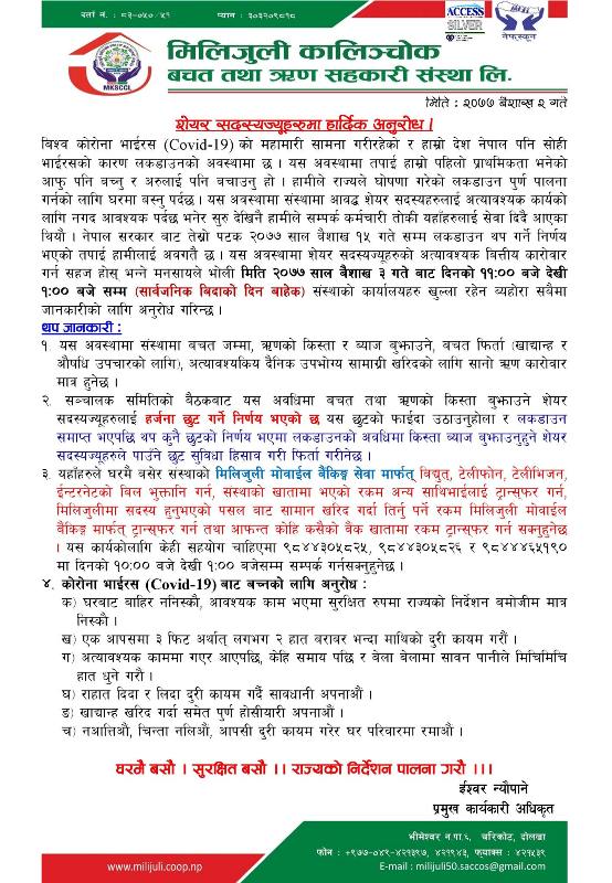 उक्त अवधिमा संस्थाले सदस्यहरुलाई आवश्यक पर्ने खाद्यायान्न तथा औषधी उपचारकालागि आश्यक रकम झिक्न तथा सानो कर्जाको कारोबार गर्न सकिने जनाएको छ । साथै सदस्यले उक्त अवधिमा बचत तथा कर्जाको किस्ता बुझाएमा लाग्ने हर्जाना छुट दिने जनाएको छ । कार्यालय खोलेको अवधि बाहेकमा सदस्यलाई रकम राख्न र झिक्न वा अन्य सेवा लिन परे संस्थाले तोकेको सम्पर्क ब्यक्ती मार्फत साथै संस्थाको मोबाइल बैंकिङ एप्स मार्फत घरमै बसेर सेवा लिन सकिने संस्थाका प्रमुख कार्यकारी अधिकृत, इश्वर न्यौपानेले जानकारी दिए ।