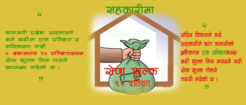 संघिय विभागले भने सहकारीले ऋण लगानीको अधिकतम एक प्रतिशतभन्दा बढी शुल्क लिन नपाउने गरी सेवा शुल्क तोक्ने तयारी गरेको छ । सेवा शुल्क निर्धारणका लागि कात्तिक अन्तिम साता विभाग महासंघसहित बचत तथा ऋणको कारोबार गर्ने केन्द्रीय संघका प्रतिनिधिहरुसँग छलफल भएको थियो । छलफलमा शुल्कबारे एकमत हुन नसकेपछि विभागले महासंघसँग लिखित सुझाव मागेको थियो ।