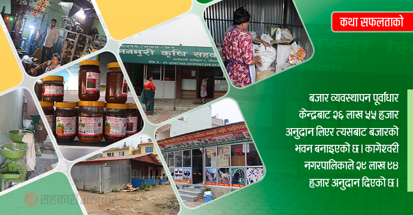बजार व्यवस्थापन पूर्वाधार केन्द्रबाट २६ लाख ५५ हजार अनुदान लिएर त्यसबाट बजारको भवन बनाइएको छ । कागेश्वरी नगरपालिकाले २९ लाख ९४ हजार अनुदान दिएको छ । त्यसबाट कृषि मिटमार्ट बनेको छ । प्रदेश सरकारले ट्रयाक्टर, कुटानी पिसानी मिल, धान काट्ने मेसिन र जिल्लाबाट थ्रेसर मेसिन ल्याएर कृषकलाई भाडामा उपलब्ध गराउने गरिएको छ ।