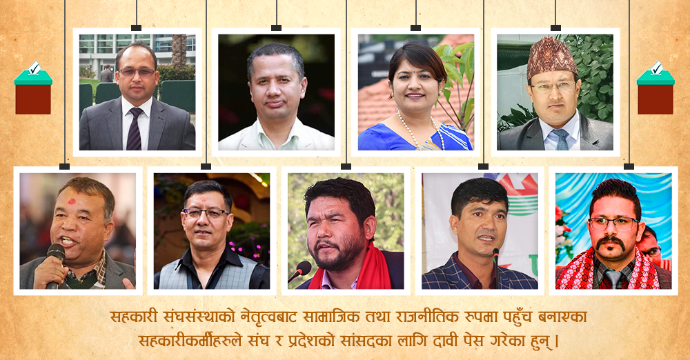 विभिन्न राजनीतिक दलका स्थानिय कमिटीहरुले संघीय सांसद तथा प्रदेशका लागि गरेको उम्मेदवार सिफारिसमा सहकारी क्षेत्रका नेताहरु पनि अटाएका छन् । कांग्रेस, एमाले र माओवादीले सहकारीकर्मीलाई सांसदको टिकटका लागि सिफारिस गरेका हुन् । एकल सिफारिसमा नपरेपनि अधिकांशले टिकट पाउने दावी गरेका छन् ।