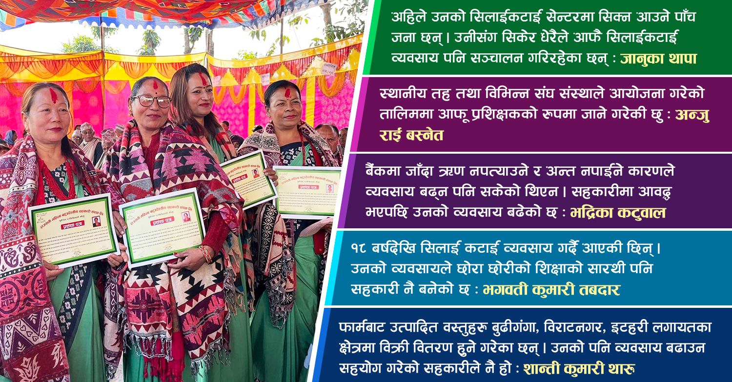‘२२ औं बार्षिक साधारण सभाको अवसरमा सहकारीले उद्यम गरेर आर्थिक रुपमा आत्मनिर्भर भएका र अरुलाई पनि रोजगारी दिएर सिप पनि सिकाएका उद्यमी महिलालाई प्रोत्साहन स्वरुप पहिलो पटक सम्मान गर्न सुरु गरेको छ’ सहकारीकी सचिव तुलसा विष्टले भनिन्, ‘यसलाई अब हरेक बर्ष सम्मान गरिने सहकारीले जनाएको छ । जसले गर्दा महिलाहरुलाई सिप सिकेपछि केही गर्नुपर्छ भन्ने उत्साह जागोस् ।’