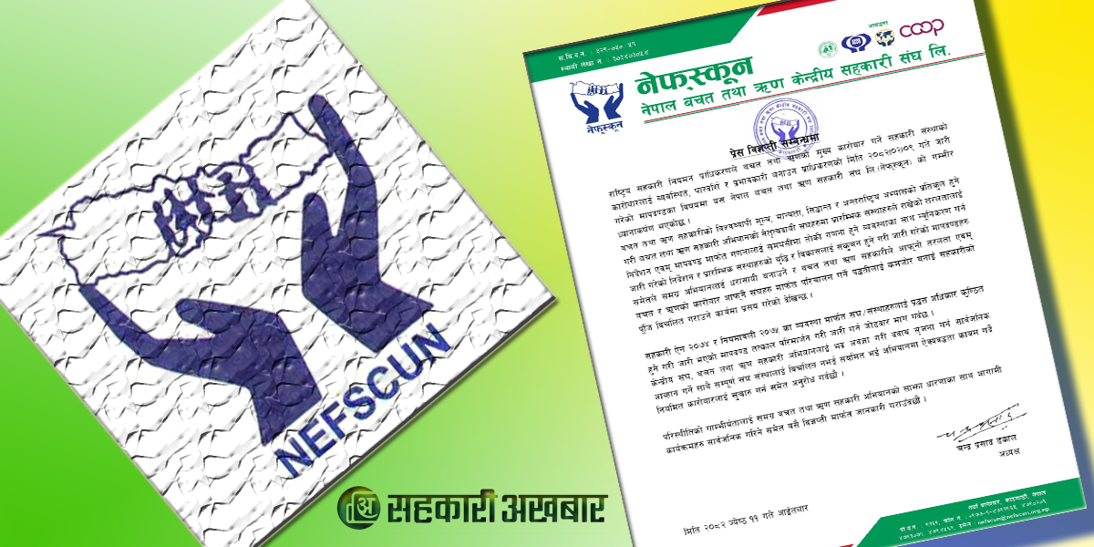 नेफ्स्कूनले समग्र बचत तथा ऋण सहकारी अभियानको साझा धारणाका साथ आगामी कार्यक्रमहरु सार्वजनिक गरिने समेत विज्ञप्तीमा भनिएको छ । सहकारी प्राधिकरणले बचत तथा ऋणको मुख्य कारोबार गर्ने सहकारी नियमनका लागि जेठ ९ गते मापदण्ड जारी गरेको थियो ।