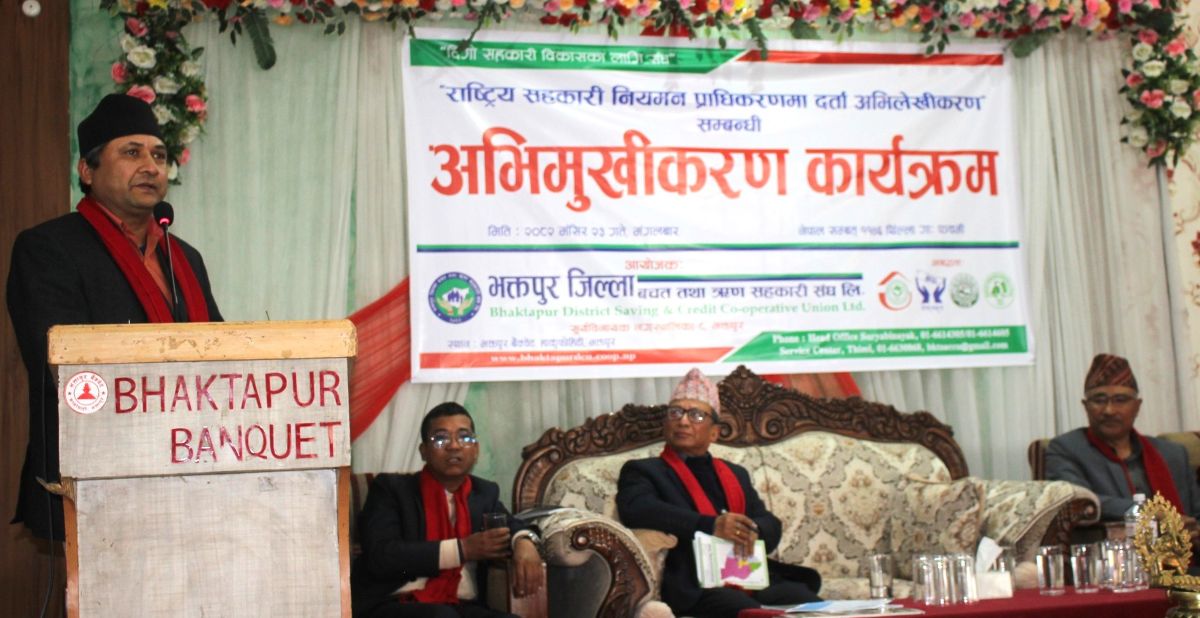 भक्तपुर जिल्ला बचत तथा ऋण सहकारी संघले राष्ट्रिय सहकारी नियमन प्राधिकरणमा दर्ता अभिलेखिकरण सम्बन्धी अभिमुखिकरण कार्यक्रममा बोल्दै विज्ञ सदस्य डा.चौलागाइ सहकारी संस्थाको नियमन तथा बर्गिकरण गर्न प्राधिकरणमा दर्ता गर्नुपर्ने बताए ।