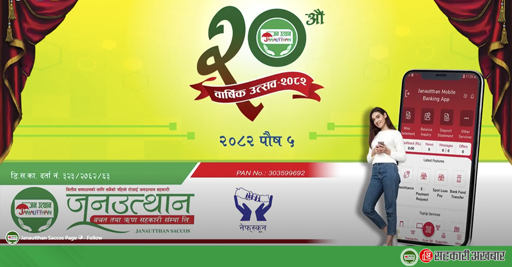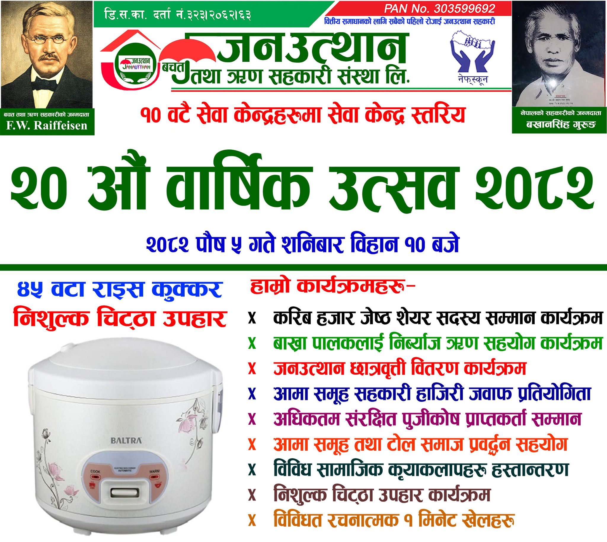 काठमाडौं । रुपन्देहीमा रहेको जनउत्थान बचत तथा ऋण सहकारी संस्थाले आज पौष ५ गते विभिन्न गतिविधि गरी २० औं बार्षिकोत्सव मनाएको छ । संस्थाले यस आवमा सामाजिक कार्य अन्तर्गत सवा ११ लाख रुपैंयाँ खर्च गरेको छ ।