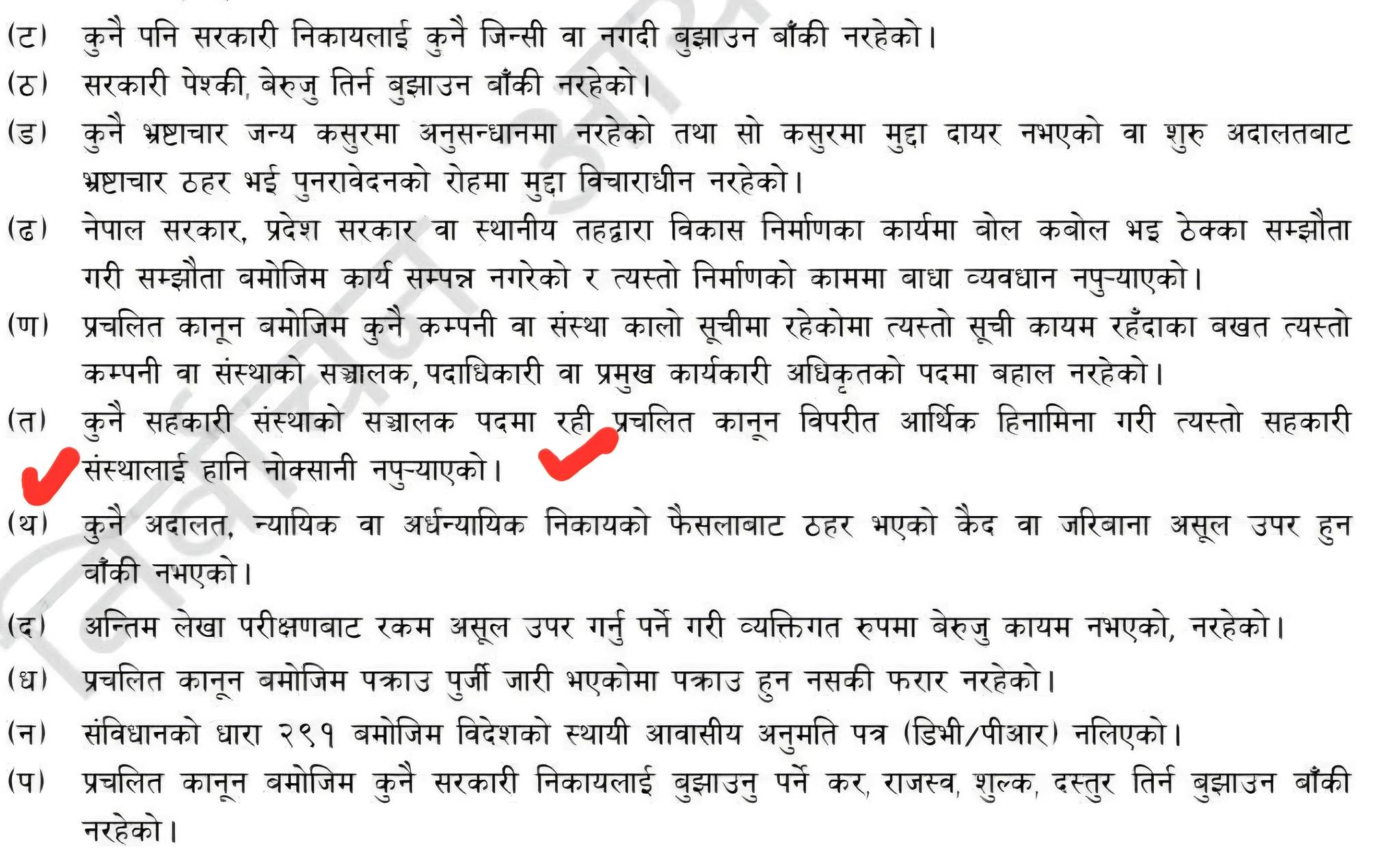 निर्वाचन आयोगले २०८२ पुष २ गते जारी गरेको प्रतिनिधि सभा निर्वाचन निर्देशिका २०८२ जारी गर्दै त्यस्तो ब्यवस्था गरेको हो । निर्देशिकामा प्रतिनिधिसभामा उम्मेदवार दिन चाहने व्यक्तिले पेश गर्नुपर्ने स्वघोषणा पत्रमा सहकारी संस्थाको संचालक पदमा रही प्रचलित कानुन बिपरित आर्थिक हिनामिना गरी संस्थालाई हानी नोक्सानी नपुर्याएको हुनुपर्ने प्रावधान राखेको छ ।