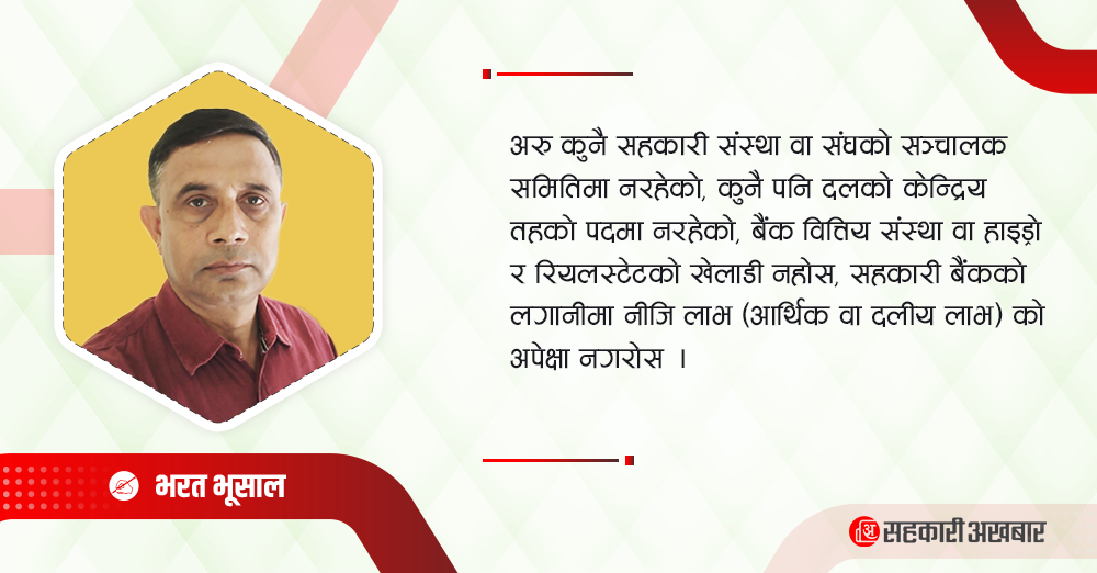दलका नेताहरुको छेउमा उभिएर फोटो खिच्दै फेसबुक रंगाउनेहरुलाई विश्वास गर्दा परिणाम नकारात्मक हुनेछ । सहकारी अभियान समाजवादको आधारशिला हो तर सहकारी नेताहरुमा यस्तो गुण कम छ । सहकारी बैंकमा कस्तो नेतृत्व चाहिन्छ भन्ने सन्दर्भमा सहकारीकै मूल्य र मान्यतालाई आत्मसात गर्ने, सामुहिक हितको आदर्श भएका, सहकारीलाई अर्थतन्त्रको तेश्रो खम्वा बनाउने चेत भएका, निजी स्वार्थ, निजी लाभ, दलीय शक्तिको खेलबाट टाढा भएको इमान्दार ब्यक्तिहरु नै अहिलेको खाँचो हो ।