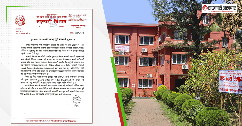 सहकारी विभागले नेपाल राष्ट्र बैंक अन्तर्गतको वित्तीय जानकारी इकाइको गोएमएल प्रणालीमा आवद्ध भई शंकास्पद तथा सीमा कारोवार र गतिविधि (एसटीआर र एसएआर तथा टीटीआर ) सम्बन्धी रिपोर्टिङ समयमै गर्न सहकारी संघ संस्थाहरुलाई भनेको छ।