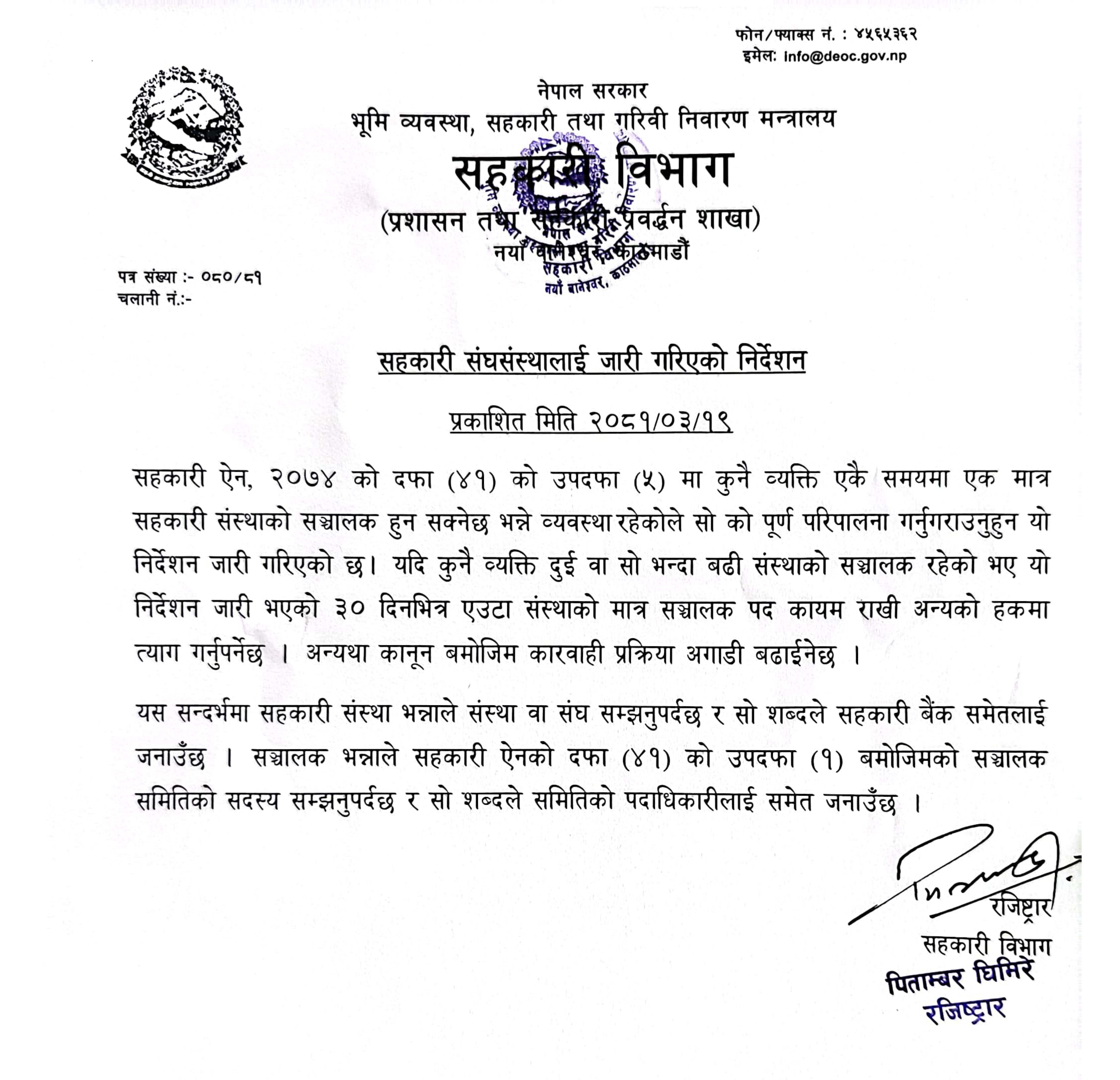 सहकारी नियमन प्राधिकरण, सहकारी विभाग र नेपाल राष्ट्र बैंकले जारी गरेको निर्देशनमा दोहोरो पद बस्न नमिल्ने उल्लेख गरेको छ । निर्देशनमा भनिएको छ, ‘कुनैपनि ब्यक्ति कुनै एक तहको सहकारी संस्थाको संचालक समितिको अध्यक्ष, उपाध्यक्ष, सचिव, कोषाध्यक्ष, लेखा समितिको संयोजक पदमा दुई कार्यकाल भन्दा बढी अवधीकालागि निर्वाचित हुनसक्ने छैन ।’ ‘कुनैपनि सदस्य एकै अवधीमा एकभन्दा वढी संस्थाको संचालक वा पदाधिकारी हुनपाइने छैन ।’