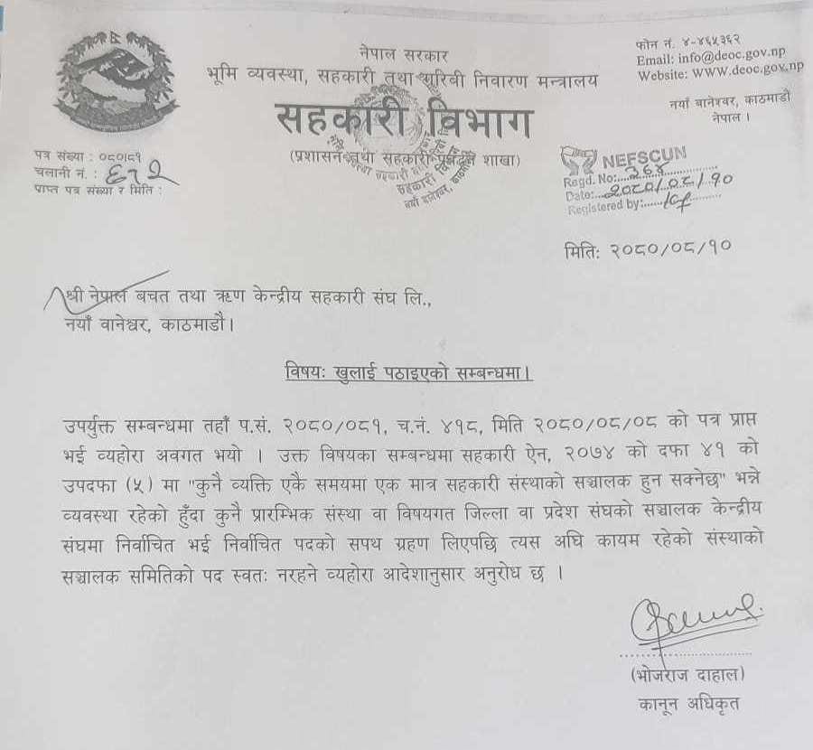 नेफ्स्कूनले २०८० साल मंसिर ८ गते सहकारी विभागलाई पत्र लेखेर दोहोरो पदको ब्याख्या गरिदिन भनेको थियो । मंसिर १० गते सहकारी विभागका कानुन अधिकृत भोजराज दाहालले हस्ताक्षर गरेको पत्रमा दोहोरो पदबारे ब्याख्या गर्दै ‘कुनै ब्यक्ति एकै समयमा एकमात्र सहकारी संस्थाको संचालक हुन सक्नेछ’ भन्ने जवाफको पत्र पठाएको देखिन्छ । तर नेफ्स्कूनका अधिकांश संचालकले दोहोरो पद छाड्नसकेका छैनन् ।
