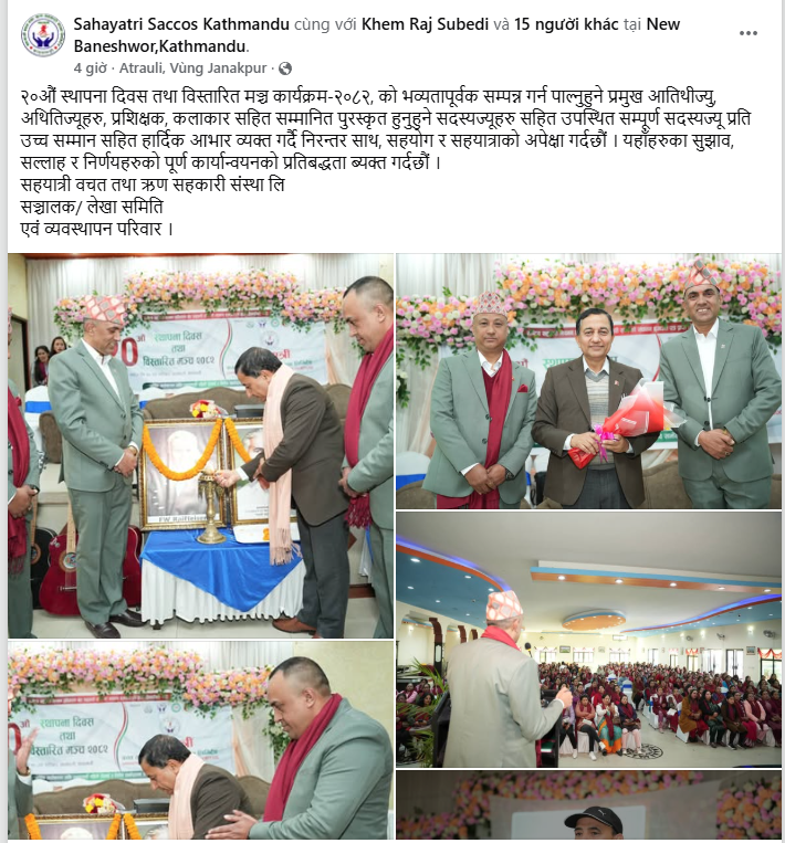 काठमाडौं । नेपाल बचत तथा ऋण केन्द्रीय सहकारी संघ (नेफ्स्कून) का संचालक कार्यकारी प्रमुख रहेको सहकारी संस्थाको कार्यक्रममा सहकारी नियमन प्राधिकरणका अध्यक्ष नै प्रमुख अतिथि रहेको पाइएको छ । संघका संचालक खेमराज सुवेदी कार्यकारी प्रमुख रहेको काठमाडौंको सहयात्री बचत तथा ऋण सहकारी संस्थाको कार्यक्रममा प्राधिकरणका अध्यक्ष डा.खगराज शर्मा प्रमुख अतिथि रहेका हुन ।
