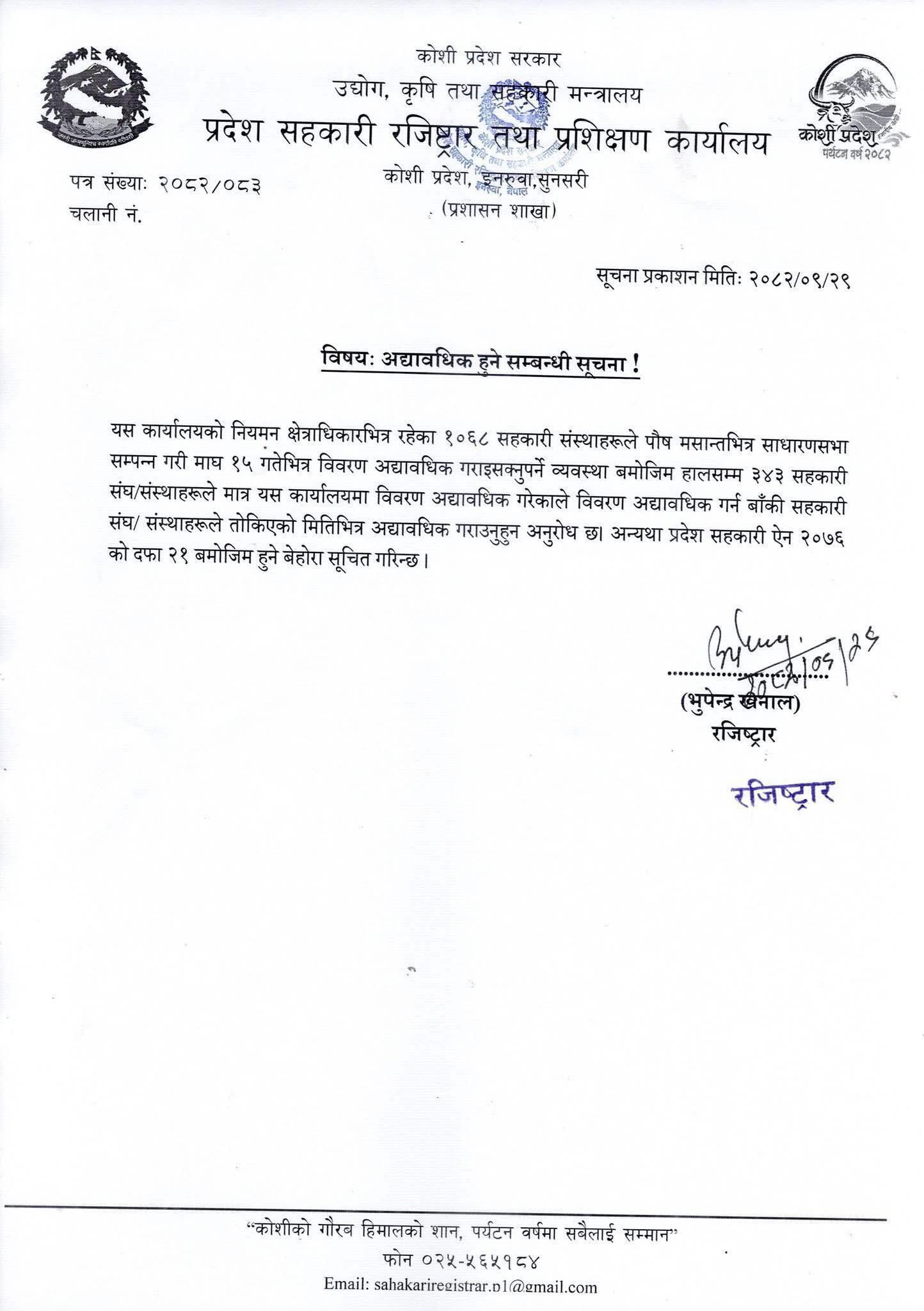 कार्यालयले सहकारी संघसंस्थाको पछिल्लो विवरण अद्यावधिक गर्न सूचना जारी गर्दै संस्थाको सम्पूर्ण विवरण माघ १५ गतेसम्म अद्यावधिक गर्न भनेको हो । सहकारी संघ संस्थाहरुले पुष मसान्तभित्र बार्षिक साधारण सभा सम्पन्न गरी १५ दिनभित्र नियमन निकायमा साधारण सभाको जानकारी गराइ विवरण अद्यावधिक गराइसक्नुपर्ने कानुनी प्रावधान छ ।