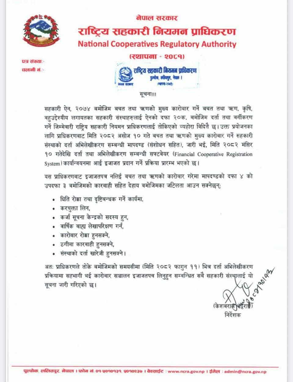 सहकारीको बर्गिकरण र बचत ऋणको मुख्य कारोबारको विषय प्राधिकरणको जिम्मामा रहेको भन्दै सवैलाई अभिलेखिकरण गर्न भनेको हो । प्राधिकरणले बचत तथा ऋणको कारोबार गर्न सबै प्रकृतिका सहकारीलाई सूचना जारी गर्दै संस्था खारेजीसम्म हुने जनाएको छ।