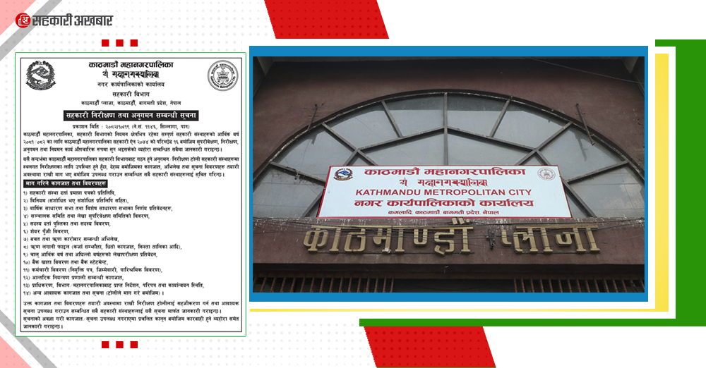 काठमाडौं । काठमाडौँ महानगरपालिकाले आफ्नो नियमन क्षेत्रभित्र रहेका सहकारी संस्थाहरूको अनुगमनलाई निरन्तरता दिनेभएको छ । महानगरपालिकाको सहकारी विभागले सूचना जारी गर्दै आर्थिक वर्ष २०८१ / ८२ का लागि सुपरीवेक्षण, निरीक्षण, अनुगमन तथा नियमन कार्य अघि बढाइने जनाएको हो । अनुगमनकालागि महानगरको सहकारी विभागको टोली सहकारी संस्थामा स्थलगत रूपमा उपस्थित हुने भएकाले आवश्यक कागजात र विवरण तयारी अवस्थामा राख्न निर्देशन दिइएको छ ।
