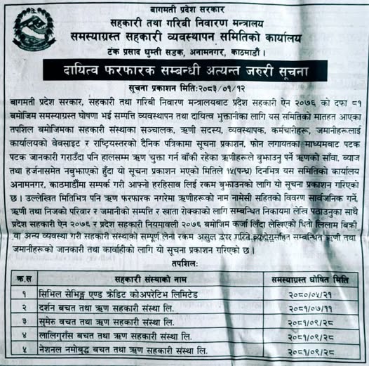समितिले सिभिल सेभिङ्ग एण्ड क्रेडिट कोअपरेटिभ, दर्शन बचत तथा ऋण सहकारी, सुमेरु वचत तथा ऋण सहकारी, लालिगुराँस बचत तथा ऋण सहकारी र नेशनल नमोबुद्ध बचत तथा ऋण सहकारी संस्थाका ऋणी र सरोकारवालाहरुलाई हिसाव फरफारकका लागि सूचना जारी गरेको हो।