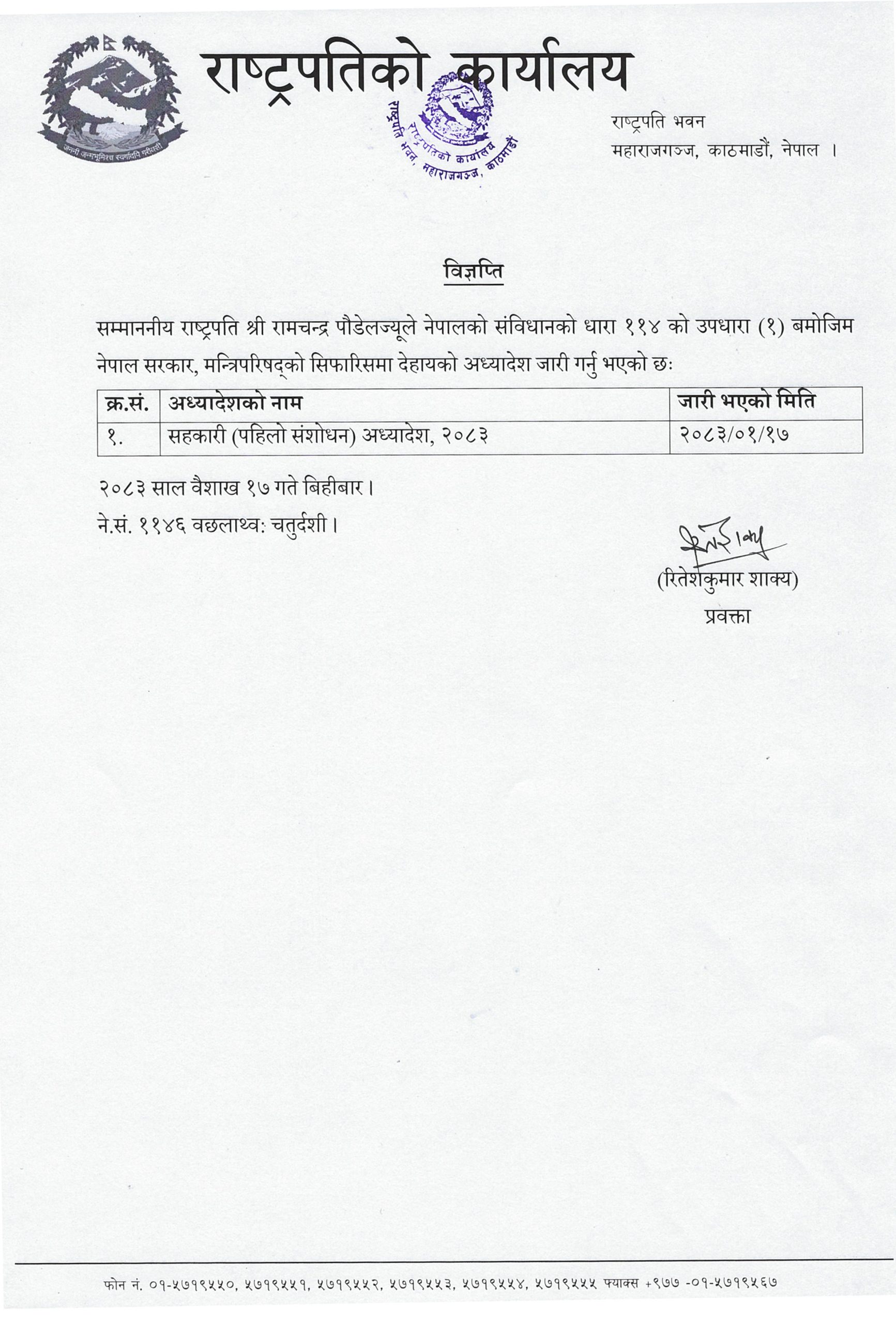 संविधानको धारा ११४ को उपधारा १ बमोजिम सहकारी (पहिलो संशोधन) अध्यादेश, २०८३ जारी गरिएको राष्ट्रपति कार्यालयका प्रवक्ता रितेशकुमार शाक्यले जनाएका छन् ।