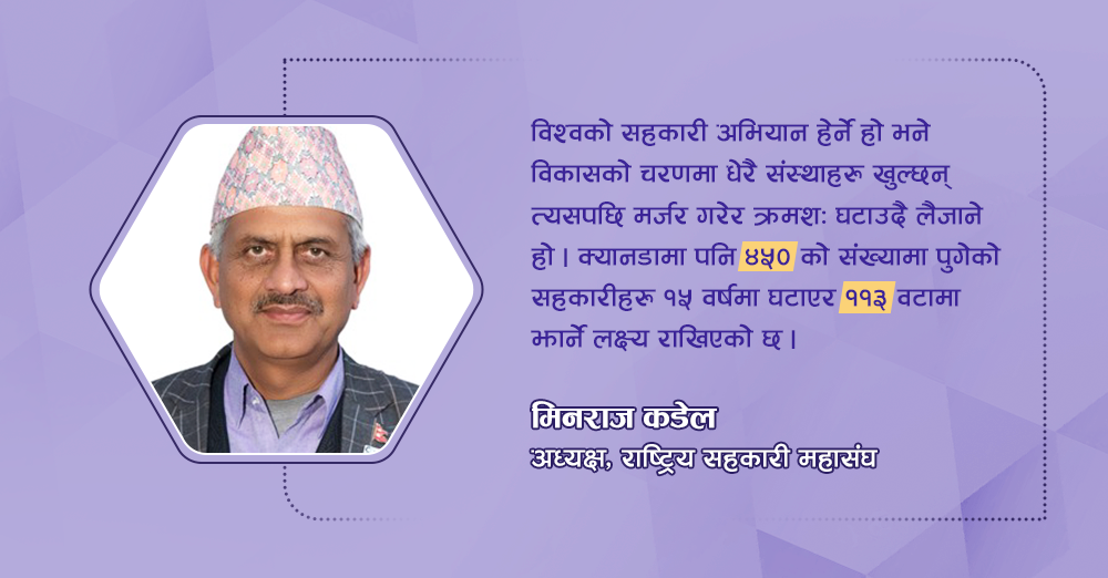 यसबाट के देखाउँछ भने संस्था जति ठूलो भयो पुँजी, प्रविधिका हिसावले सेवा दिन सकिन्छ । त्यसैले हामीले संघिय मन्त्रालयमार्फत नगरपालिकाहरुसम्म बचत तथा ऋण सहकारीहरुको दर्ता बन्द गरौं र मर्जर अभियान संचालन गरौं भनेका छौं । वागमती प्रदेश सरकारले त बचत तथा ऋण संस्था दर्ता बन्द गरेको छ । अहिले देखिएको आर्थिक मन्दीबाट सहकारीलाई बचाउनका लागि पनि मर्जर आवश्यक छ ।