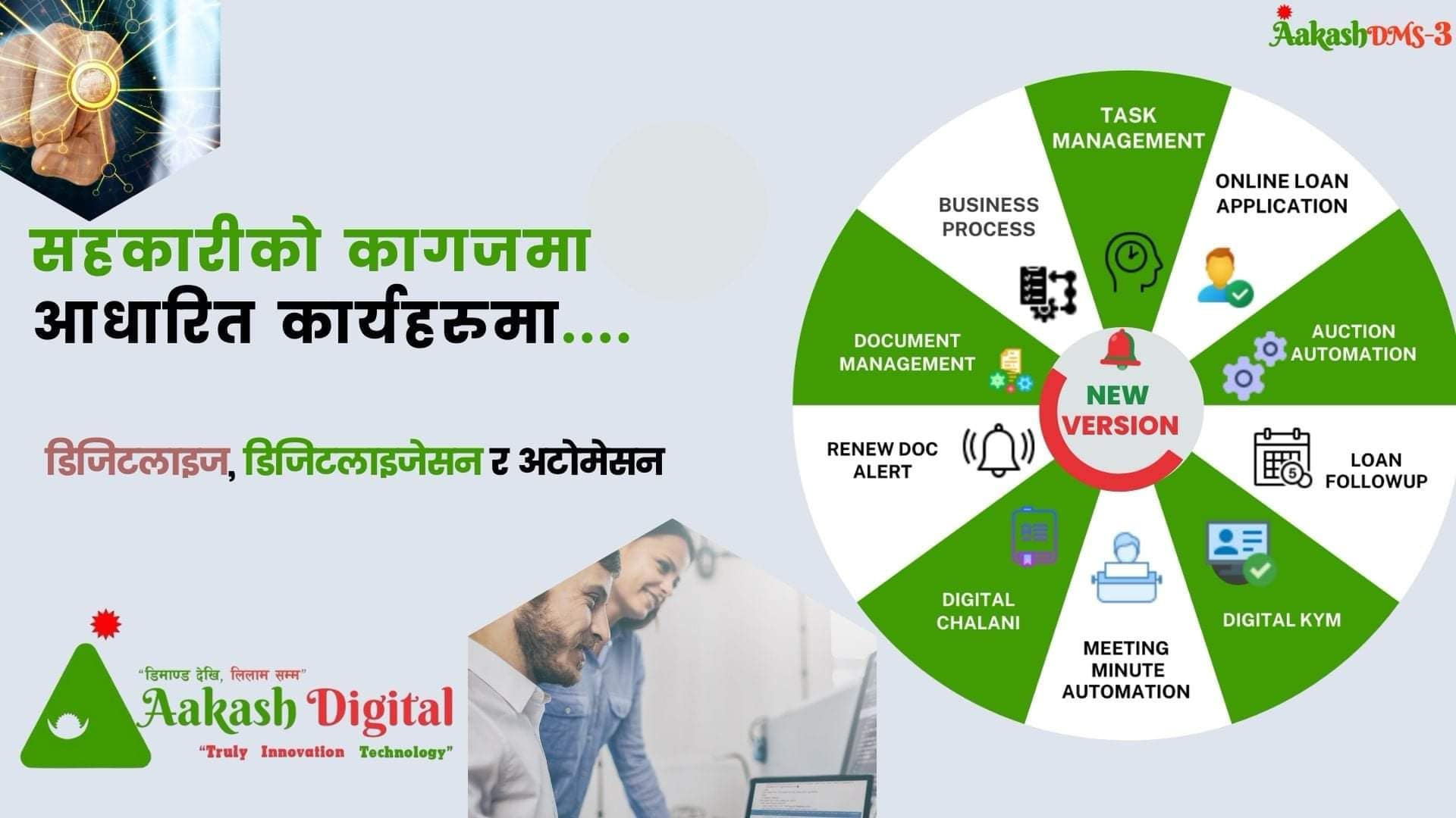 काठमाडौं । सहकारीमा दैनिक रूपमा प्रयोग हुने कागजी कार्यलाई अटोमेसन गर्दै आइरहेको आकाश डिजिटलले नयाँ भर्जन सार्वजनिक गरेको छ । आकाश डिजिटलले सहकारीका सदस्यले अनलाइनबाटै ऋणको आवेदन दिन सक्नेगरि भर्जन थ्रि सार्वजनिक गरेको हो ।