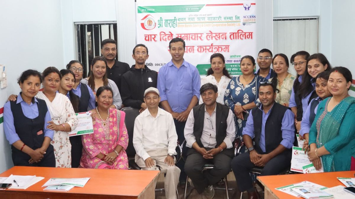 काठमाडौं । भक्तपुरको श्री बाराही बचत तथा ऋण सहकारी संस्थाले समाचार लेखन तालिम सम्पन्न गरेको छ । संस्थाले संस्थाका कर्मचारी तथा पदाधिकारीलाई चारदिने समाचार लेखन लालिम दिएको हो । संस्थाको सदस्य तथा बचत उपसमितिको आयोजनामा संस्थाका गतिविधि, घटना, कार्यक्रमहरुलाई लिपीबद्ध गर्न र लेखन कला अभिबृद्धि गराउने उद्देश्यले तालिम दिएको जनाइएको छ । संस्थाका उपसमिति संयोजक शर्मिला मानन्धरको अध्यक्षता तथा अध्यक्ष राधेश्याम सुवाल, व्यवस्थापक शिवजी हाकुदुवाल र प्रशिक्षक प्रेम प्रजापतिको आतिथ्यतामासमापन तालिम कार्यक्रम सम्पन्न भएको हो ।