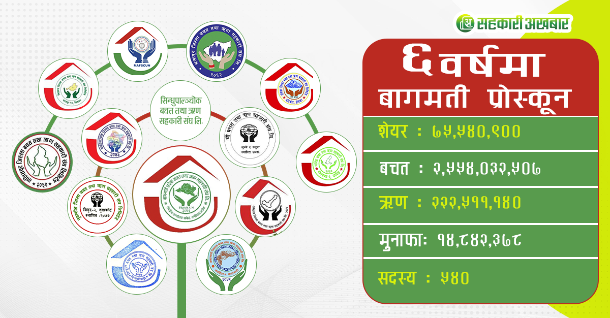 काठमाडौं । बागमती प्रदेश बचत तथा ऋण सहकारी संघ (बागमती प्रोस्कून) छैटौं वर्षमा प्रवेश गरेको छ । संघ बागमती प्रदेशमा रहेका बचत तथा ऋण सहकारी संघ संस्थाहरुलाई ब्यवस्थित र मर्यादित बनाई सुशासनमा संचालन गर्न २०७६ सालमा स्थापना भएको हो ।