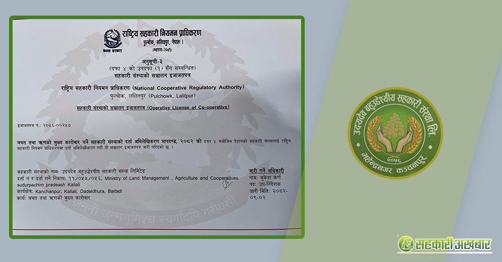 काठमाडौं । महेन्द्रनगर कञ्चनपुरमा केन्द्रीय कार्यालय रहेको उदयदेव बहुउद्देश्यीय सहकारी संस्थाले राष्ट्रिय सहकारी नियमन प्राधिकरणबाट बचत ऋण सञ्चालन इजाजतपत्र प्राप्त गरेको छ । नियमन प्राधिकरणले उदयदेव बहुउद्देश्यीय सहकारी संस्थालाई पौष २ गते इजाजतपत्र प्रदान गरेको हो ।