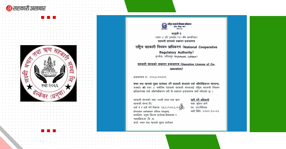 काठमाडौं । धनुषा जिल्लाको मिथिला नगरपालिका ७ मा रहेको लक्ष्मी बचत तथा ऋण सहकारी संस्थाले राष्ट्रिय सहकारी नियमन प्राधिकरणबाट संचालन इजाजतपत्र प्राप्त गरको छ । बचत तथा ऋणको मुख्य कारोबार गर्ने सहकारी संस्थाको दर्ता अभिलेखीकरण मापदण्ड २०८२ को दफा ४ बमोजिम उक्त संस्थाले ‘सहकारी संस्था सञ्चालन इजाजतपत्र’ प्राप्त गरेको हो।