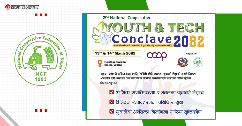 काठमाडौं । राष्ट्रिय सहकारी महासंघको आयोजनामा यही माघ १३ र १४ गते दुई दिने ‘दोस्रो राष्ट्रिय युवा तथा प्रविधि सम्मेलन २०८२’ हुन गइरहेको छ । भुमि व्यवस्था, सहकारी तथा गरिबी निवारण मन्त्रालयको सहयोगमा सम्मेलन “प्रविधि–मैत्री उद्यममा युवाको नेतृत्व” भन्ने मूल थिमका साथ सम्पन्न हुने जनाइएको छ।